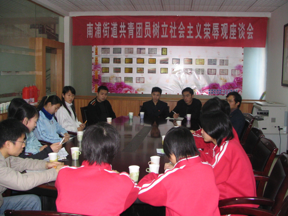 簽約儀式結束后,電氣學院黨團員代表與部分街道、院校團員代表就如何樹立“八榮八恥”社會主義榮辱觀進行了深入的座談交流,并在進賢倉社區主任唐智敏的陪同下,參觀、了解了社區面貌。