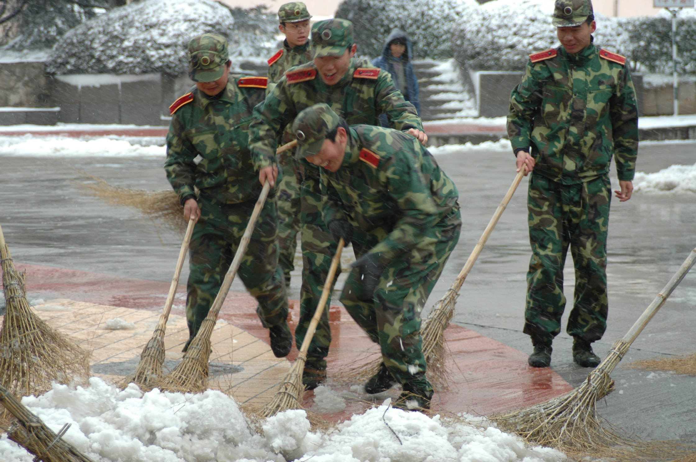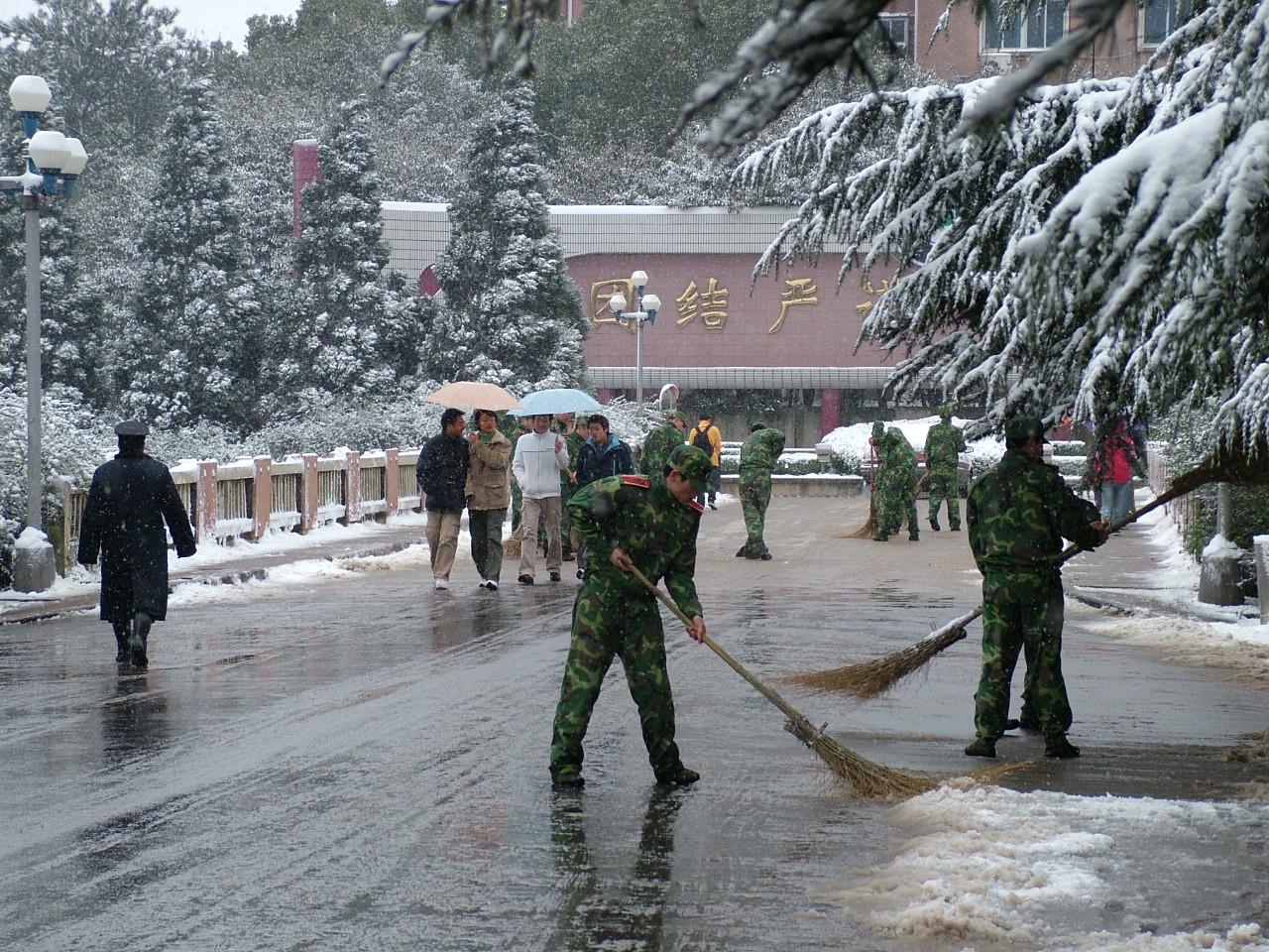 3月13日,又一場春雪悄悄降臨,整個(gè)校園一片潔白。為了方便師生行走,我校國防生早晨6:50就在校園各條道路上清掃積雪。到發(fā)稿時(shí),他們還在忙碌。有個(gè)國防生說,他們的鞋子全濕透了,但一點(diǎn)都不覺得冷。他們臉上是一臉的笑容。