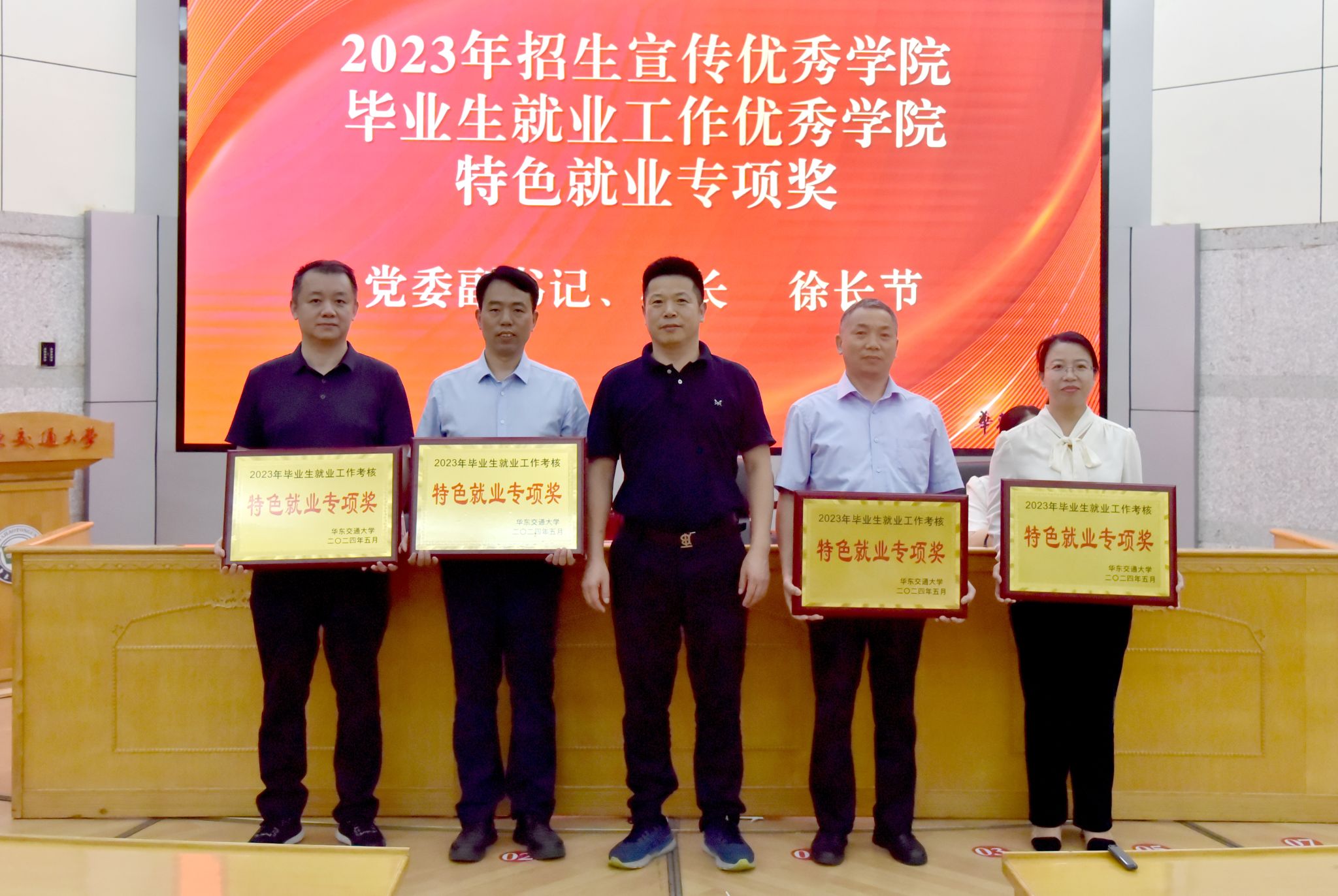 會上舉行了頒獎授牌儀式。徐長節為2023年招生宣傳優秀學院、畢業生就業工作優秀學院、特色就業專項獎頒獎。羅文俊為2023年畢業生就業工作先進個人頒獎,為“宏志助航計劃”職業生涯咨詢院級特色工作室授牌。