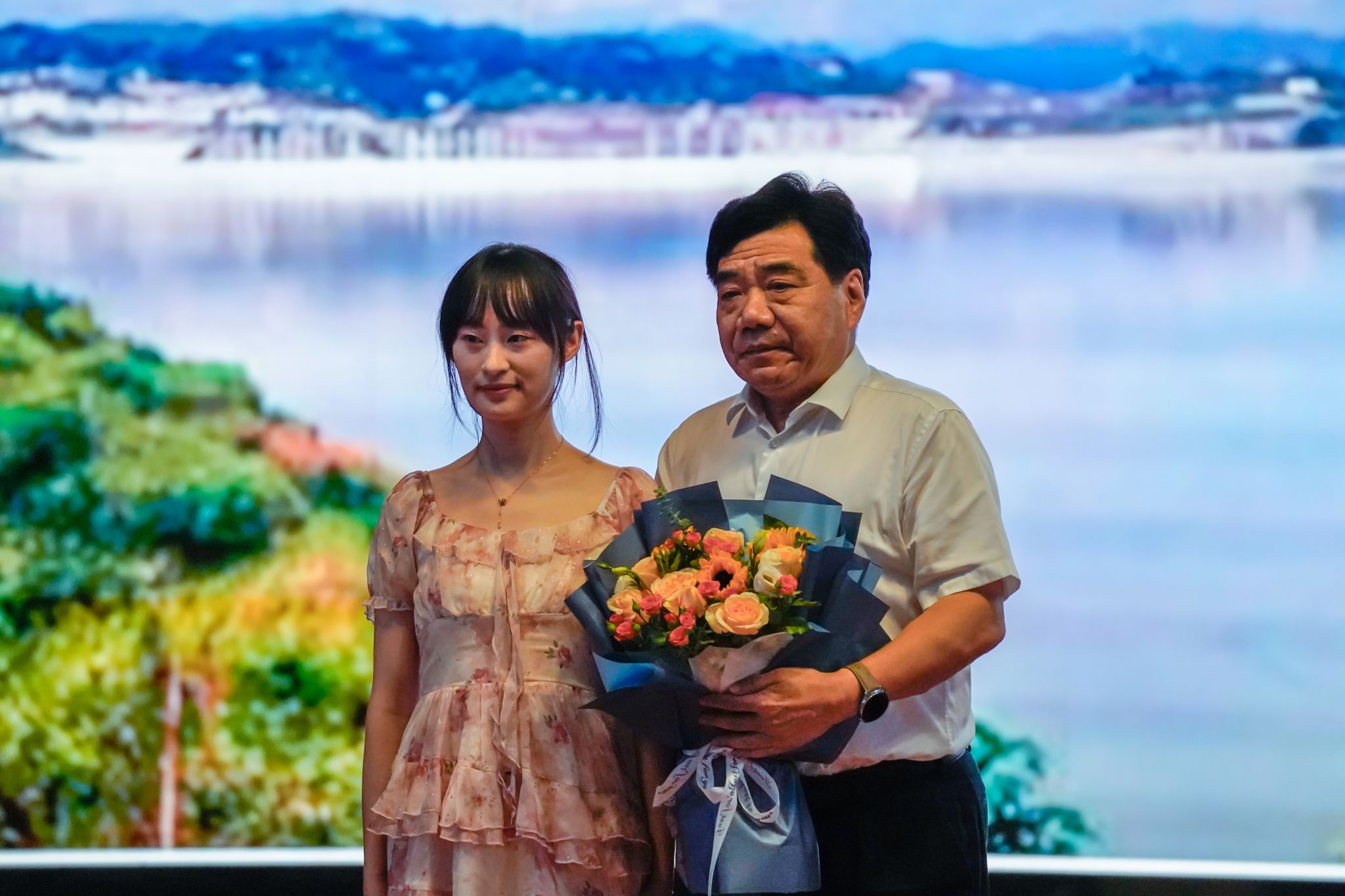 恰逢第40個教師節,課前新生代表為周創兵院士獻上鮮花與祝福。課后周創兵院士與校領導、部分新生代表合影留念。