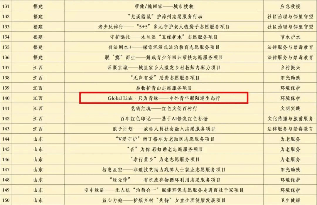 11月30日至12月1日,第七屆中國青年志愿服務項目大賽全國賽終評在廣東汕頭舉行。我校國際學院選送的“Global Link 只為青綠——中外青年鄱陽湖生態行”項目斬獲銀獎,實現了學校在該賽事中國家級獎項零的突破。此前,我校在省賽環節以1金1銀2銅創歷史最好成績,獲獎數并列全省第一。
