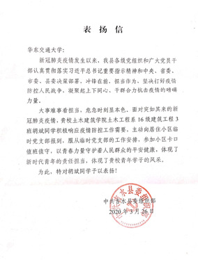 日前,我校收到來自中共吉水縣委組織部的表揚信,肯定我校土建學院學生胡斌面對突如其來的新冠肺炎疫情,積極響應疫情防控工作需要,以青春力量守護著人民群眾的平安健康,體現了新時代青年的責任擔當,展現了“花椒”學子風采,為社區“疫”線貢獻青春力量。