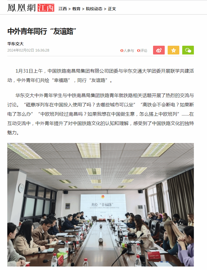 1月31日上午,中國鐵路南昌局集團有限公司團委與華東交通大學團委開展聯學共建活動,中外青年們共繪“幸福路”,同行“友誼路”。