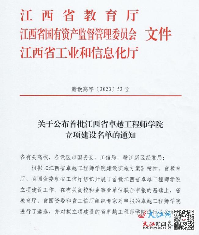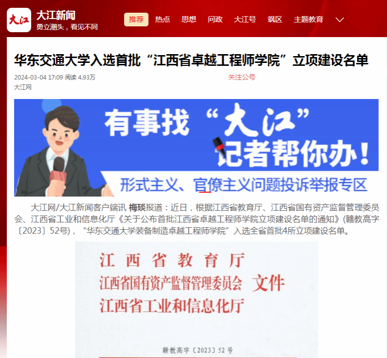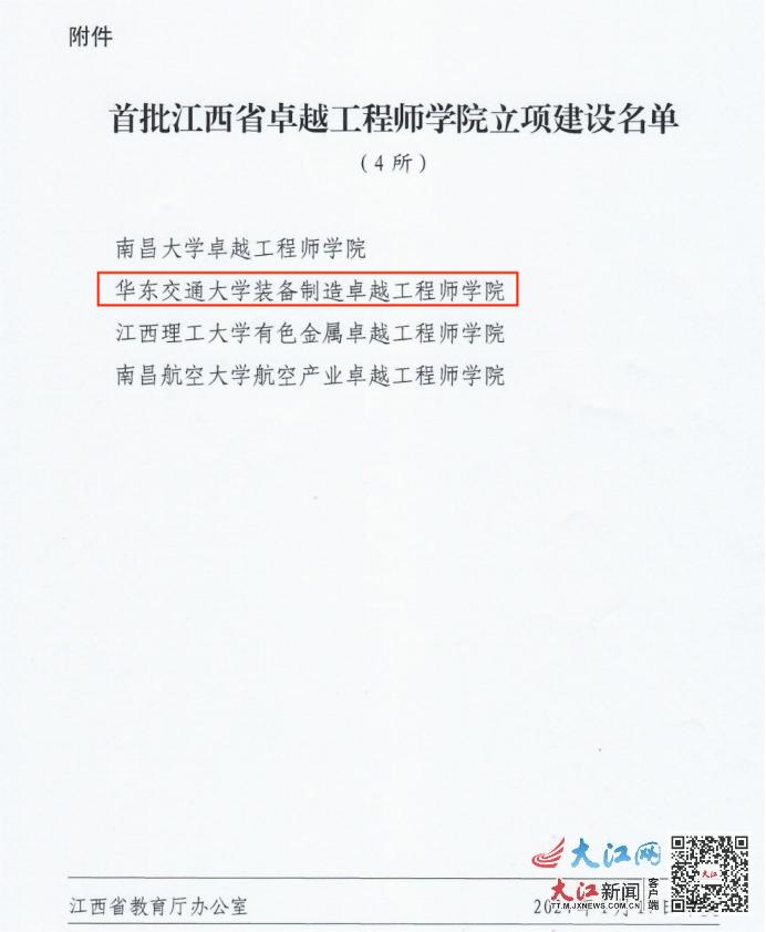 近日,根據江西省教育廳、江西省國有資產監督管理委員會、江西省工業和信息化廳《關于公布首批江西省卓越工程師學院立項建設名單的通知》(贛教高字〔2023〕52號),“華東交通大學裝備制造卓越工程師學院”入選全省首批4所立項建設名單。