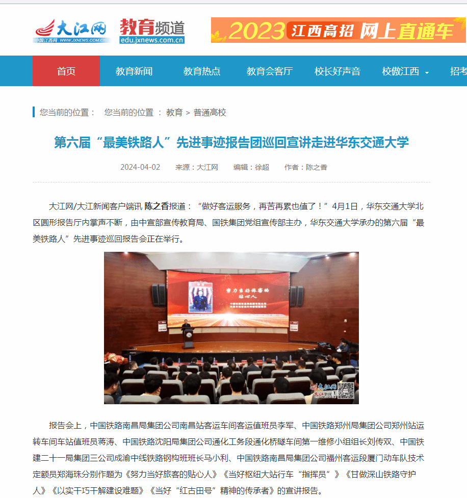 “做好客運(yùn)服務(wù),再苦再累也值了!”4月1日,華東交通大學(xué)北區(qū)圓形報(bào)告廳內(nèi)掌聲不斷,由中宣部宣傳教育局、國(guó)鐵集團(tuán)黨組宣傳部主辦,華東交通大學(xué)承辦的第六屆“最美鐵路人”先進(jìn)事跡巡回報(bào)告會(huì)正在舉行。