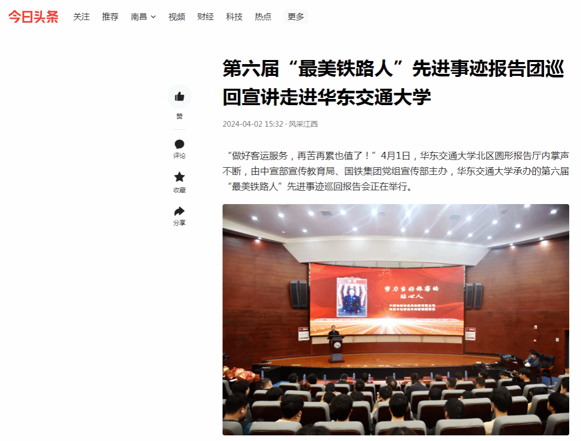 “做好客運(yùn)服務(wù),再苦再累也值了!”4月1日,華東交通大學(xué)北區(qū)圓形報(bào)告廳內(nèi)掌聲不斷,由中宣部宣傳教育局、國(guó)鐵集團(tuán)黨組宣傳部主辦,華東交通大學(xué)承辦的第六屆“最美鐵路人”先進(jìn)事跡巡回報(bào)告會(huì)正在舉行。