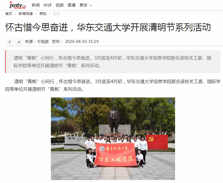 清明“青帆”心同行,懷古惜今思奮進(jìn)。3月底至4月初,華東交通大學(xué)信息學(xué)院聯(lián)合該校關(guān)工委、國際學(xué)院等單位開展清明節(jié)“青帆”系列活動。