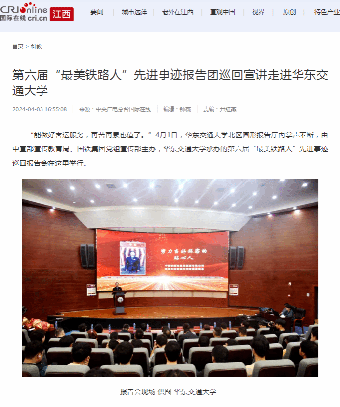 “能做好客運服務,再苦再累也值了。”4月1日,華東交通大學北區圓形報告廳內掌聲不斷,由中宣部宣傳教育局、國鐵集團黨組宣傳部主辦,華東交通大學承辦的第六屆“最美鐵路人”先進事跡巡回報告會在這里舉行。