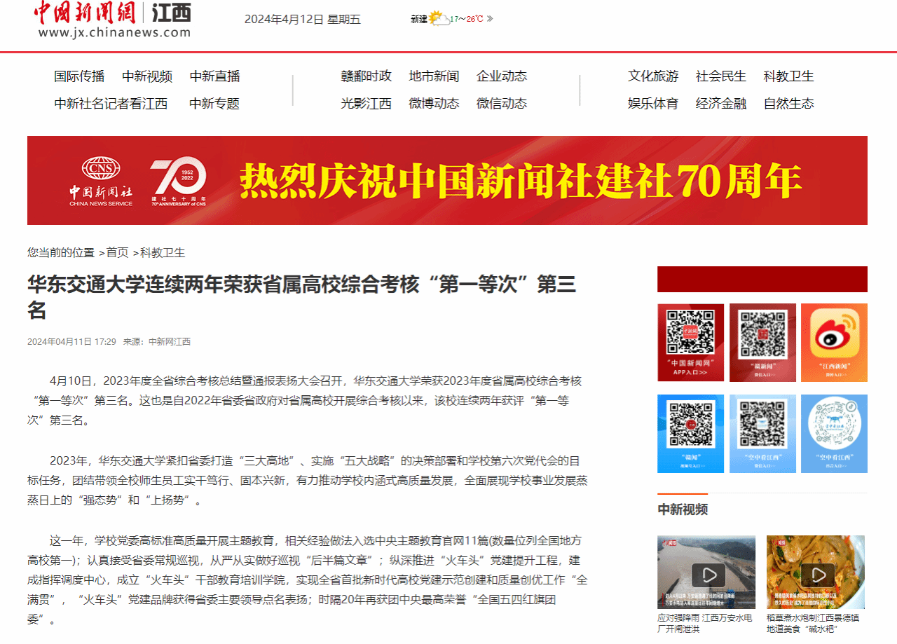 【中新網江西】華東交通大學連續兩年榮獲省屬高校綜合考核“第一等次”第三名