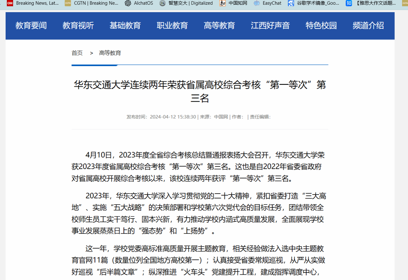【中國(guó)網(wǎng)】華東交通大學(xué)連續(xù)兩年榮獲省屬高校綜合考核“第一等次”第三名