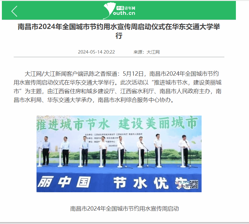 5月12日,南昌市2024年全國城市節約用水宣傳周啟動儀式在華東交通大學舉行。此次活動以“推進城市節水,建設美麗城市”為主題,由江西省住房和城鄉建設廳、江西省水利廳、南昌市人民政府主辦,南昌市水利局、華東交通大學承辦,南昌市水利綜合服務中心協辦。