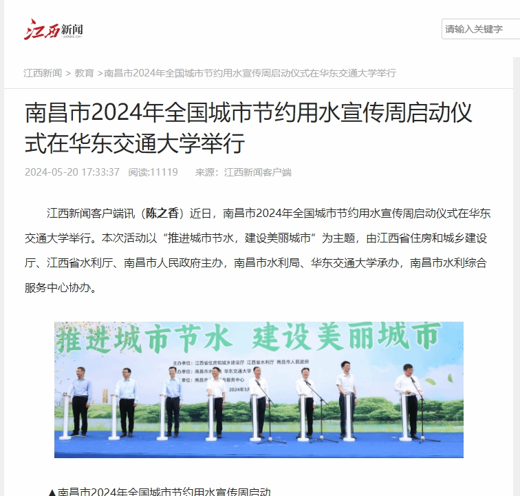江西新聞客戶端訊(陳之香)近日,南昌市2024年全國城市節約用水宣傳周啟動儀式在華東交通大學舉行。本次活動以“推進城市節水,建設美麗城市”為主題,由江西省住房和城鄉建設廳、江西省水利廳、南昌市人民政府主辦,南昌市水利局、華東交通大學承辦,南昌市水利綜合服務中心協辦。
