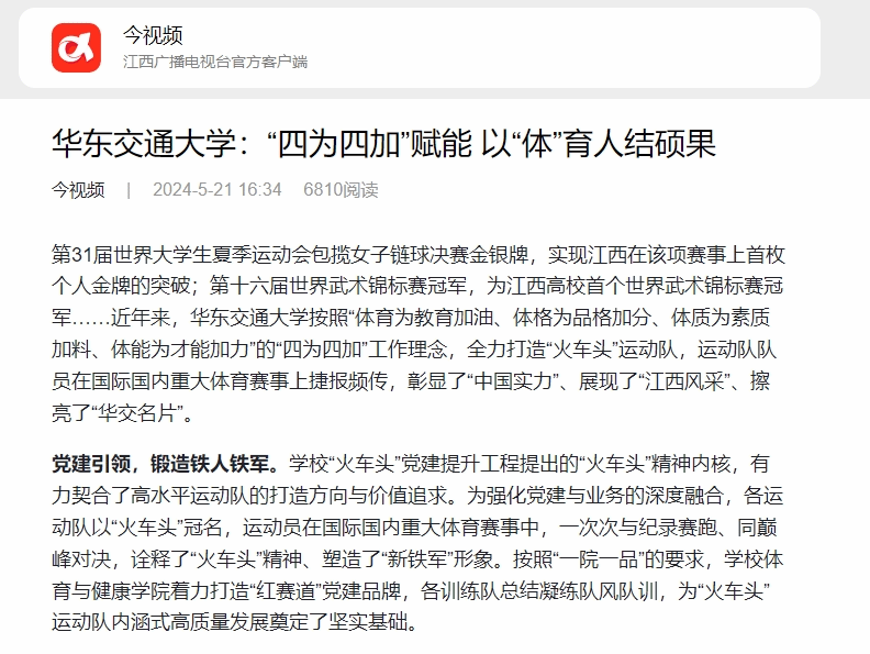 第31屆世界大學(xué)生夏季運動會包攬女子鏈球決賽金銀牌,實現(xiàn)江西在該項賽事上首枚個人金牌的突破;第十六屆世界武術(shù)錦標(biāo)賽冠軍,為江西高校首個世界武術(shù)錦標(biāo)賽冠軍……近年來,華東交通大學(xué)按照“體育為教育加油、體格為品格加分、體質(zhì)為素質(zhì)加料、體能為才能加力”的“四為四加”工作理念,全力打造“火車頭”運動隊,運動隊隊員在國際國內(nèi)重大體育賽事上捷報頻傳,彰顯了“中國實力”、展現(xiàn)了“江西風(fēng)采”、擦亮了“華交名片”。