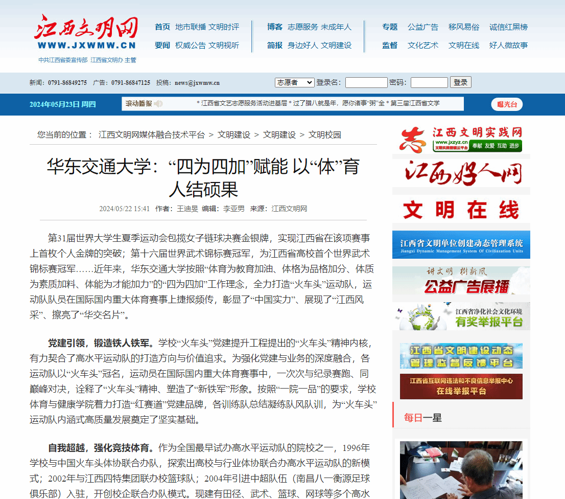 第31屆世界大學(xué)生夏季運(yùn)動會包攬女子鏈球決賽金銀牌,實(shí)現(xiàn)江西省在該項(xiàng)賽事上首枚個人金牌的突破;第十六屆世界武術(shù)錦標(biāo)賽冠軍,為江西省高校首個世界武術(shù)錦標(biāo)賽冠軍……近年來,華東交通大學(xué)按照“體育為教育加油、體格為品格加分、體質(zhì)為素質(zhì)加料、體能為才能加力”的“四為四加”工作理念,全力打造“火車頭”運(yùn)動隊(duì),運(yùn)動隊(duì)隊(duì)員在國際國內(nèi)重大體育賽事上捷報(bào)頻傳,彰顯了“中國實(shí)力”、展現(xiàn)了“江西風(fēng)采”、擦亮了“華交名片”。