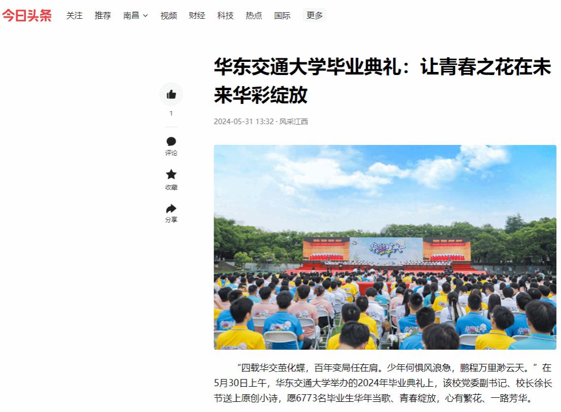 “四載華交繭化蝶,百年變局任在肩。少年何懼風浪急,鵬程萬里渺云天。”在5月30日上午,華東交通大學舉辦的2024年畢業典禮上,該校黨委副書記、校長徐長節送上原創小詩,愿6773名畢業生華年當歌、青春綻放,心有繁花、一路芳華。