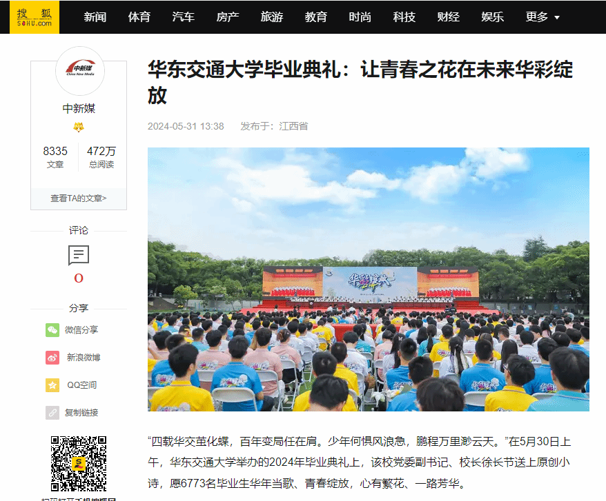 “四載華交繭化蝶,百年變局任在肩。少年何懼風(fēng)浪急,鵬程萬(wàn)里渺云天。”在5月30日上午,華東交通大學(xué)舉辦的2024年畢業(yè)典禮上,該校黨委副書(shū)記、校長(zhǎng)徐長(zhǎng)節(jié)送上原創(chuàng)小詩(shī),愿6773名畢業(yè)生華年當(dāng)歌、青春綻放,心有繁花、一路芳華。