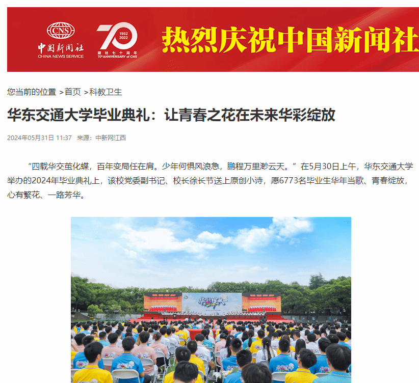 “四載華交繭化蝶,百年變局任在肩。少年何懼風浪急,鵬程萬里渺云天。”在5月30日上午,華東交通大學舉辦的2024年畢業(yè)典禮上,該校黨委副書記、校長徐長節(jié)送上原創(chuàng)小詩,愿6773名畢業(yè)生華年當歌、青春綻放,心有繁花、一路芳華。
