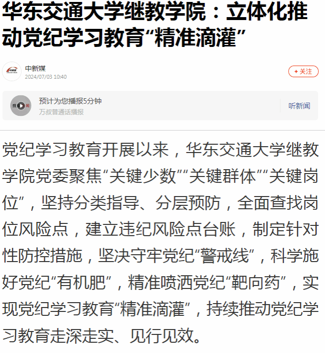 黨紀學習教育開展以來,華東交通大學繼教學院黨委聚焦“關鍵少數”“關鍵群體”“關鍵崗位”,堅持分類指導、分層預防,全面查找崗位風險點,建立違紀風險點臺賬,制定針對性防控措施,堅決守牢黨紀“警戒線”,科學施好黨紀“有機肥”,精準噴灑黨紀“靶向藥”,實現黨紀學習教育“精準滴灌”,持續推動黨紀學習教育走深走實、見行見效。