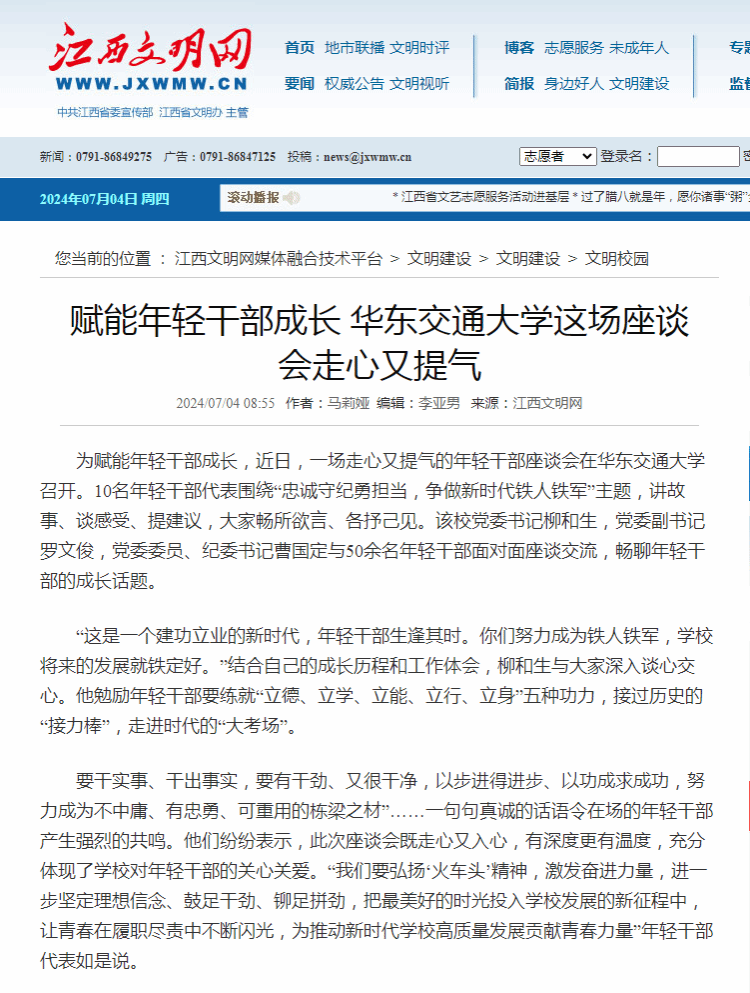 為賦能年輕干部成長,近日,一場走心又提氣的年輕干部座談會在華東交通大學(xué)召開。10名年輕干部代表圍繞“忠誠守紀(jì)勇?lián)?dāng),爭做新時代鐵人鐵軍”主題,講故事、談感受、提建議,大家暢所欲言、各抒己見。該校黨委書記柳和生,黨委副書記羅文俊,黨委委員、紀(jì)委書記曹國定與50余名年輕干部面對面座談交流,暢聊年輕干部的成長話題。