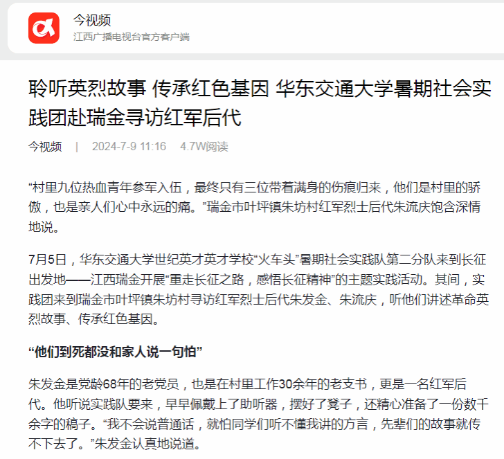 7月5日,華東交通大學(xué)世紀(jì)英才英才學(xué)校“火車頭”暑期社會實踐隊第二分隊來到長征出發(fā)地——江西瑞金開展“重走長征之路,感悟長征精神”的主題實踐活動。其間,實踐團(tuán)來到瑞金市葉坪鎮(zhèn)朱坊村尋訪紅軍烈士后代朱發(fā)金、朱流慶,聽他們講述革命英烈故事、傳承紅色基因。