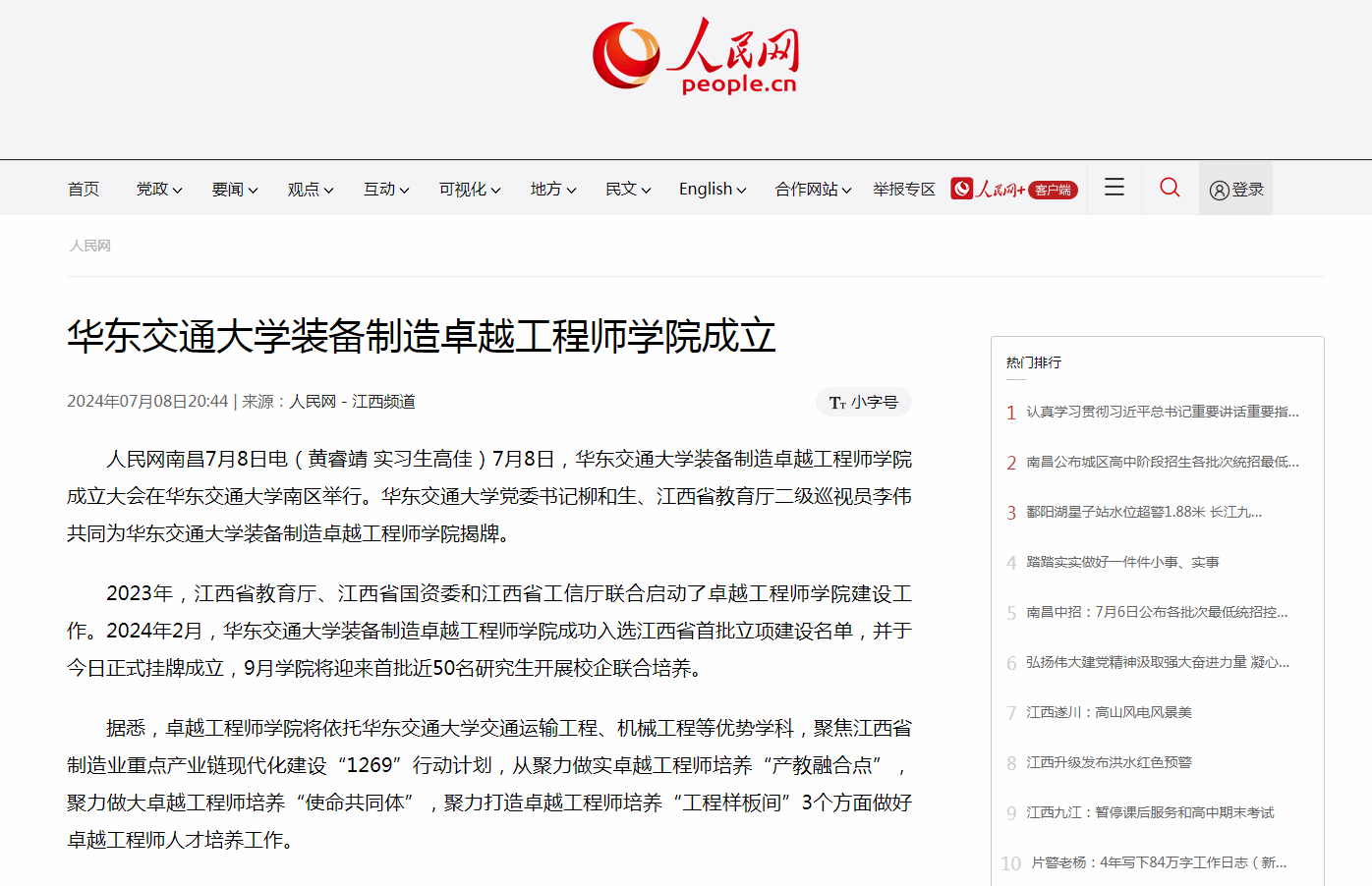 【人民網】華東交通大學裝備制造卓越工程師學院成立
