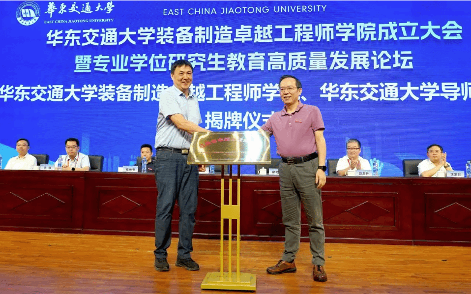 7月8日,華東交通大學舉行裝備制造卓越工程師學院成立大會暨專業學位研究生教育高質量發展論壇。江西省教育廳二級巡視員李偉和華東交通大學黨委書記柳和生為華東交通大學裝備制造卓越工程師學院揭牌。江西省教育廳高教處處長陳軍和華東交通大學黨委副書記、校長徐長節為華東交通大學導師學院揭牌。