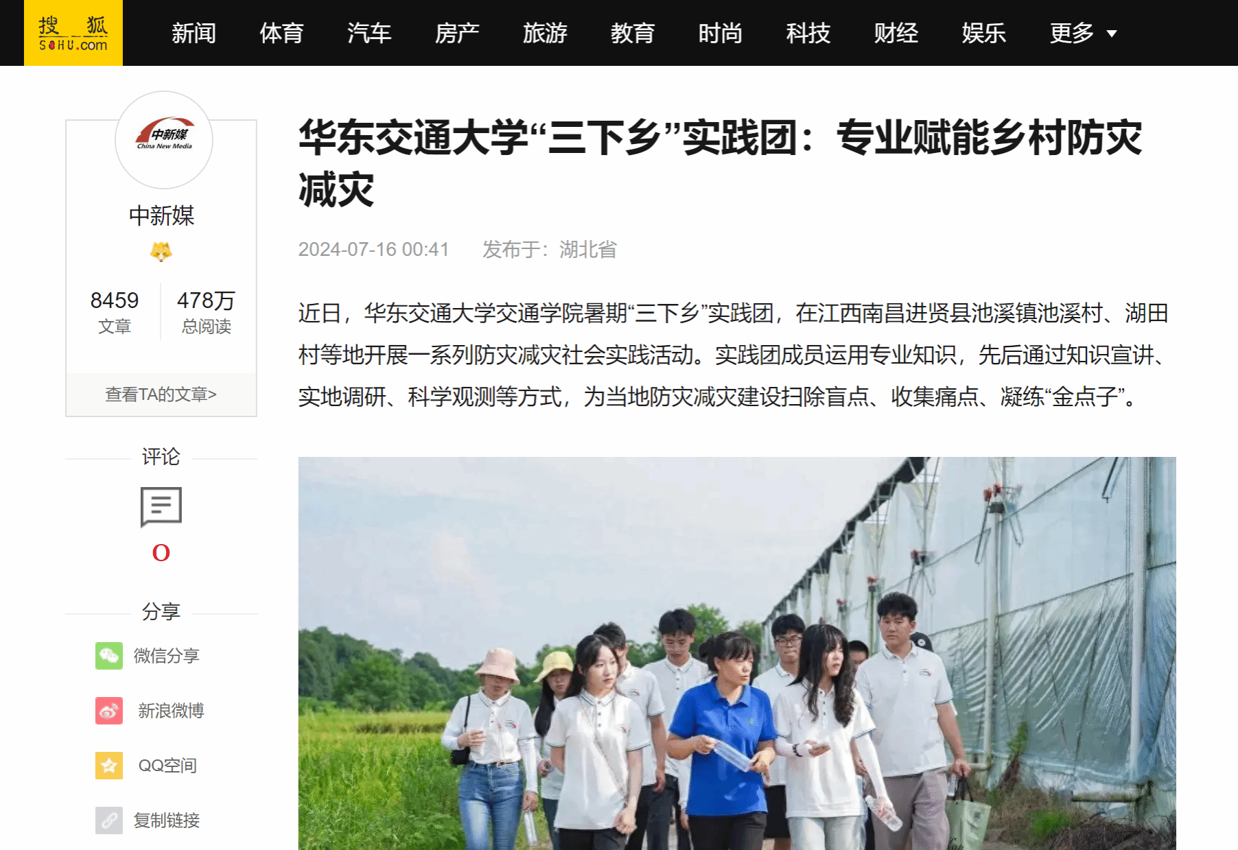 近日,華東交通大學交通學院暑期“三下鄉(xiāng)”實踐團,在江西南昌進賢縣池溪鎮(zhèn)池溪村、湖田村等地開展一系列防災減災社會實踐活動。實踐團成員運用專業(yè)知識,先后通過知識宣講、實地調(diào)研、科學觀測等方式,為當?shù)胤罏臏p災建設掃除盲點、收集痛點、凝練“金點子”。