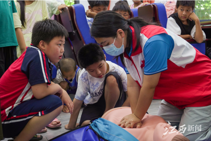結合近期當地影響人民群眾生命財產安全的案例,實踐隊成員在湖田村挨家挨戶開展入戶宣講,向村民講述自然災害危害,普及防災減災知識,講授避險技能,幫助村民提升防災避險意識。實踐團“紅十字隊”隊員們還為孩子們上了一堂繪聲繪色的“急救實踐課”。隊員們通過理論講解和實踐操作,為當地的孩子們普及了心肺復蘇、創傷處理、止血包扎等急救技能,在他們的心中種下一顆“防災減災”的種子。