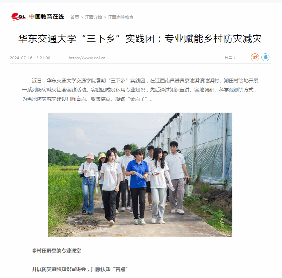 近日,華東交通大學交通學院暑期“三下鄉(xiāng)”實踐團,在江西南昌進賢縣池溪鎮(zhèn)池溪村、湖田村等地開展一系列防災減災社會實踐活動。實踐團成員運用專業(yè)知識,先后通過知識宣講、實地調研、科學觀測等方式,為當地防災減災建設掃除盲點、收集痛點、凝練“金點子”。