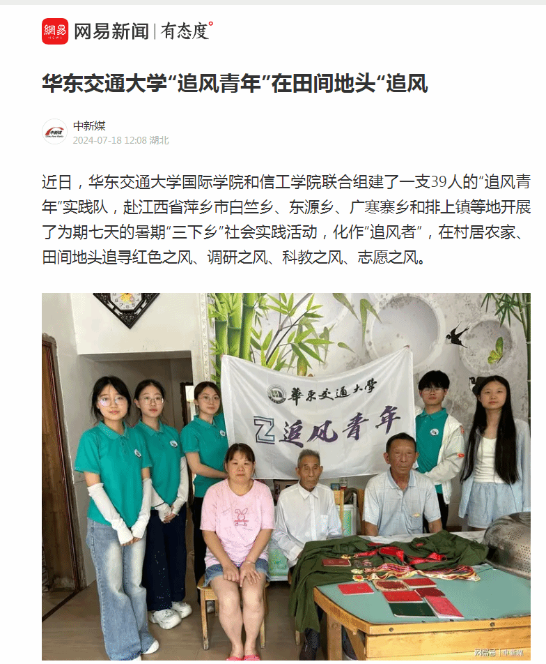 近日,華東交通大學(xué)國際學(xué)院和信工學(xué)院聯(lián)合組建了一支39人的“追風(fēng)青年”實(shí)踐隊(duì),赴江西省萍鄉(xiāng)市白竺鄉(xiāng)、東源鄉(xiāng)、廣寒寨鄉(xiāng)和排上鎮(zhèn)等地開展了為期七天的暑期“三下鄉(xiāng)”社會(huì)實(shí)踐活動(dòng),化作“追風(fēng)者”,在村居農(nóng)家、田間地頭追尋紅色之風(fēng)、調(diào)研之風(fēng)、科教之風(fēng)、志愿之風(fēng)。