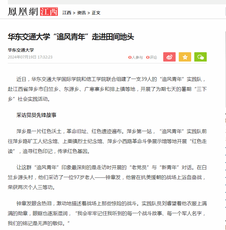 近日,華東交通大學(xué)國際學(xué)院和信工學(xué)院聯(lián)合組建了一支39人的“追風(fēng)青年”實(shí)踐隊(duì),赴江西省萍鄉(xiāng)市白竺鄉(xiāng)、東源鄉(xiāng)、廣寒寨鄉(xiāng)和排上鎮(zhèn)等地,開展了為期七天的暑期“三下鄉(xiāng)”社會(huì)實(shí)踐活動(dòng)。