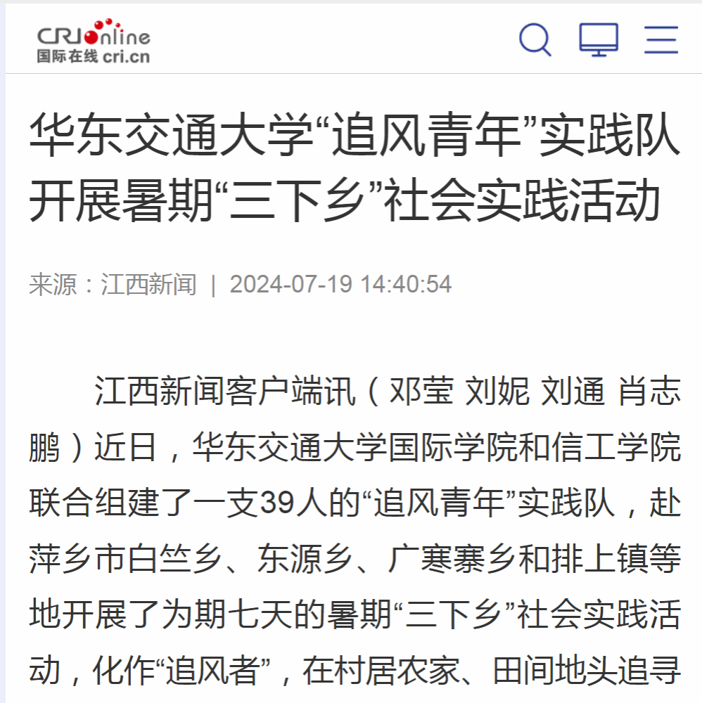 近日,華東交通大學國際學院和信工學院聯合組建了一支39人的“追風青年”實踐隊,赴萍鄉市白竺鄉、東源鄉、廣寒寨鄉和排上鎮等地開展了為期七天的暑期“三下鄉”社會實踐活動,化作“追風者”,在村居農家、田間地頭追尋紅色之風、調研之風、科教之風、志愿之風。
