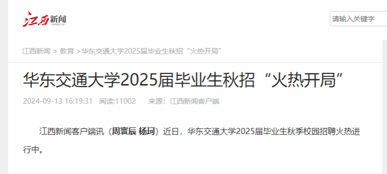 近日,華東交通大學(xué)2025屆畢業(yè)生秋季校園招聘火熱進(jìn)行中。