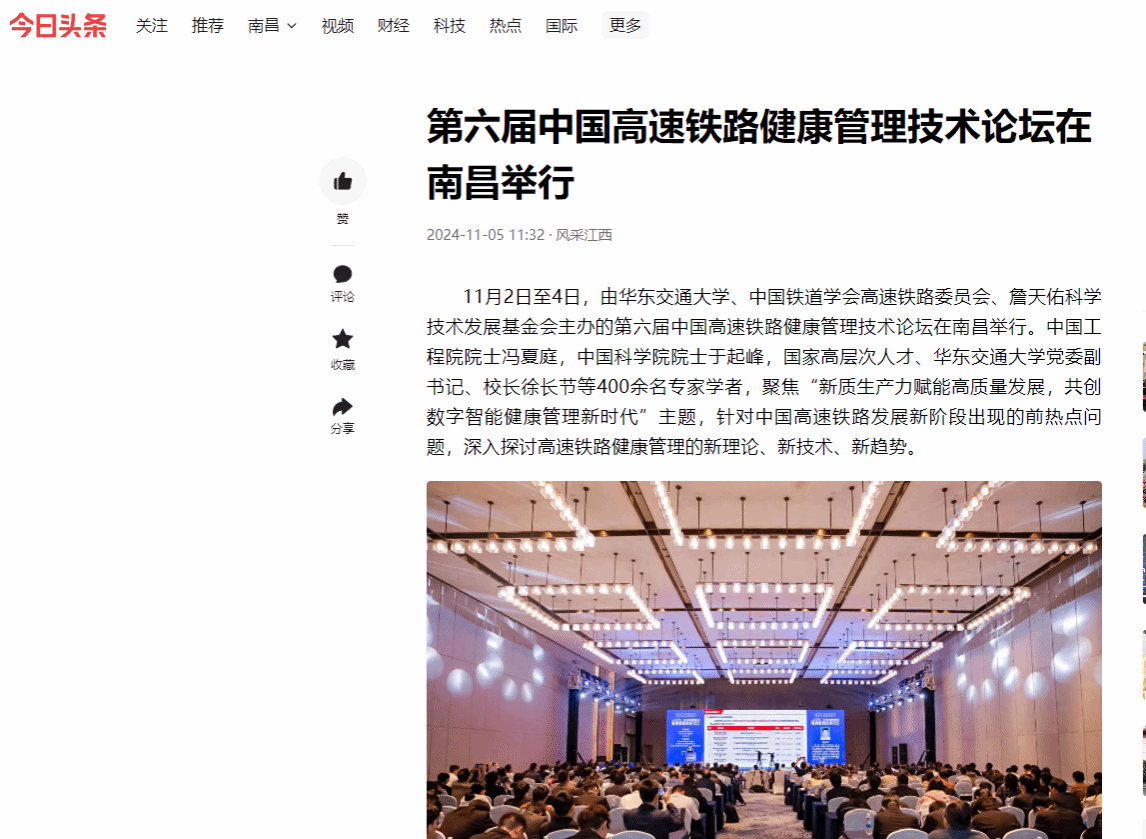 11月2日至4日,由華東交通大學、中國鐵道學會高速鐵路委員會、詹天佑科學技術發(fā)展基金會主辦的第六屆中國高速鐵路健康管理技術論壇在南昌舉行。中國工程院院士馮夏庭,中國科學院院士于起峰,國家高層次人才、華東交通大學黨委副書記、校長徐長節(jié)等400余名專家學者,聚焦“新質生產力賦能高質量發(fā)展,共創(chuàng)數(shù)字智能健康管理新時代”主題,針對中國高速鐵路發(fā)展新階段出現(xiàn)的前熱點問題,深入探討高速鐵路健康管理的新理論、新技術、新趨勢。