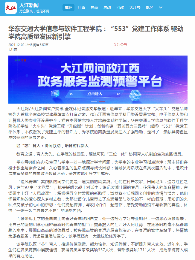 近年來,華東交通大學“火車頭”黨建品牌被列為首批全省高校黨建品牌重點打造對象。作為江西省信息學科門類設置最完整、電子信息大類和計算機大類專業開設最齊全,擁有本碩博完整人才培養體系的學院,華東交通大學信息與軟件工程學院依托學校“火車頭”黨建工程“升級版”計劃,創新構建“五芯五力三品牌”(簡稱“553”)黨建工作體系,不僅激發了黨建工作的新活力,為學院的高質量發展注入了強勁動,走出了一條獨具特色且成效斐然的發展之路。